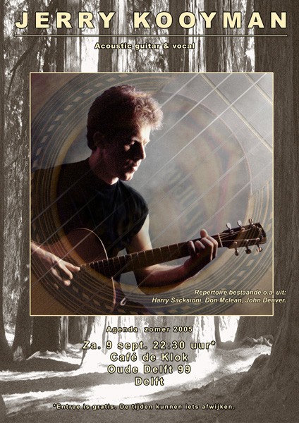 Beste mensen, Zaterdag 9 september zal ik een optreden geven in: Café de Klok om 22:30 Oude Delft 99, Delft Entree gratis Er staat een foutje op de afbeelding, 2005 moet zijn 2006 Maar de rest klopt wel hoor. Groet, Jerry